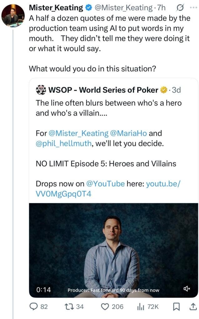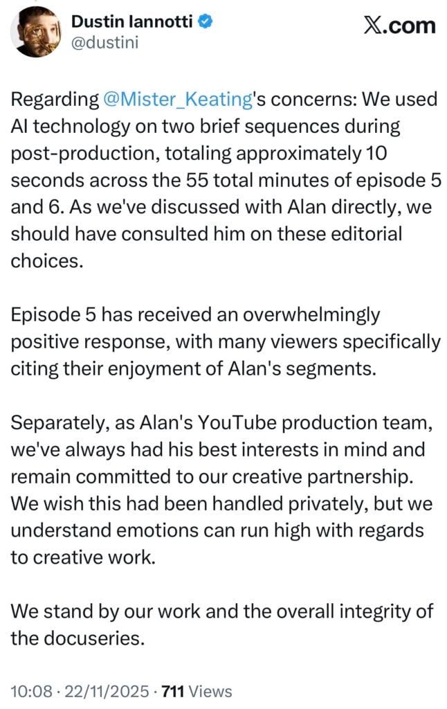How did this come to light? Not because the series had a disclaimer that it used AI; not because the production company or any producers ever thought to say anything like, oh, by the way, we have used AI to enhance the storytelling; but because one of the players, Alan Keating, noticed something fishy about his own appearance and called the thing out on Twitter.