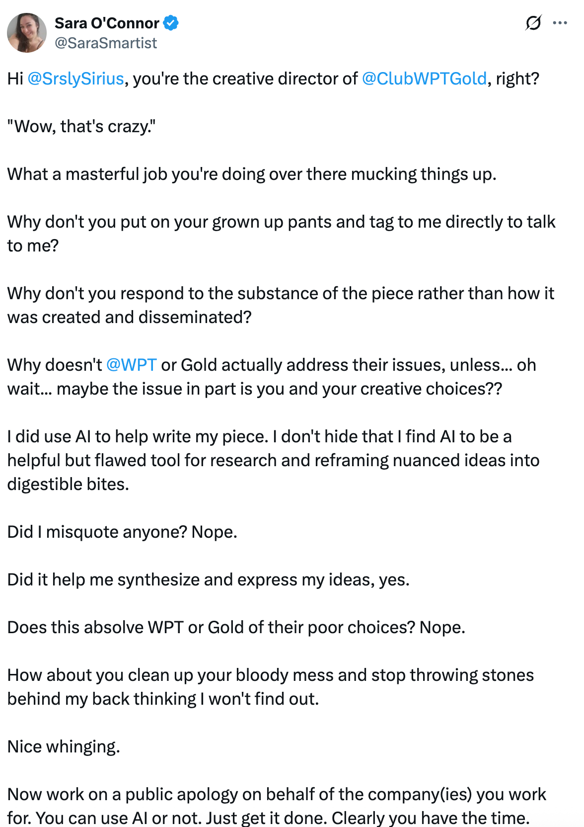 After I published this piece, I was made aware of yet another AI content drama in the poker world, this one regarding the use of Chat-GPT in writing an article for pokerlistings.com, here. After being called out for publishing AI-generated content, the author of the piece in question doubled down to say that, actually, it was natural and fine and all writers do this.4