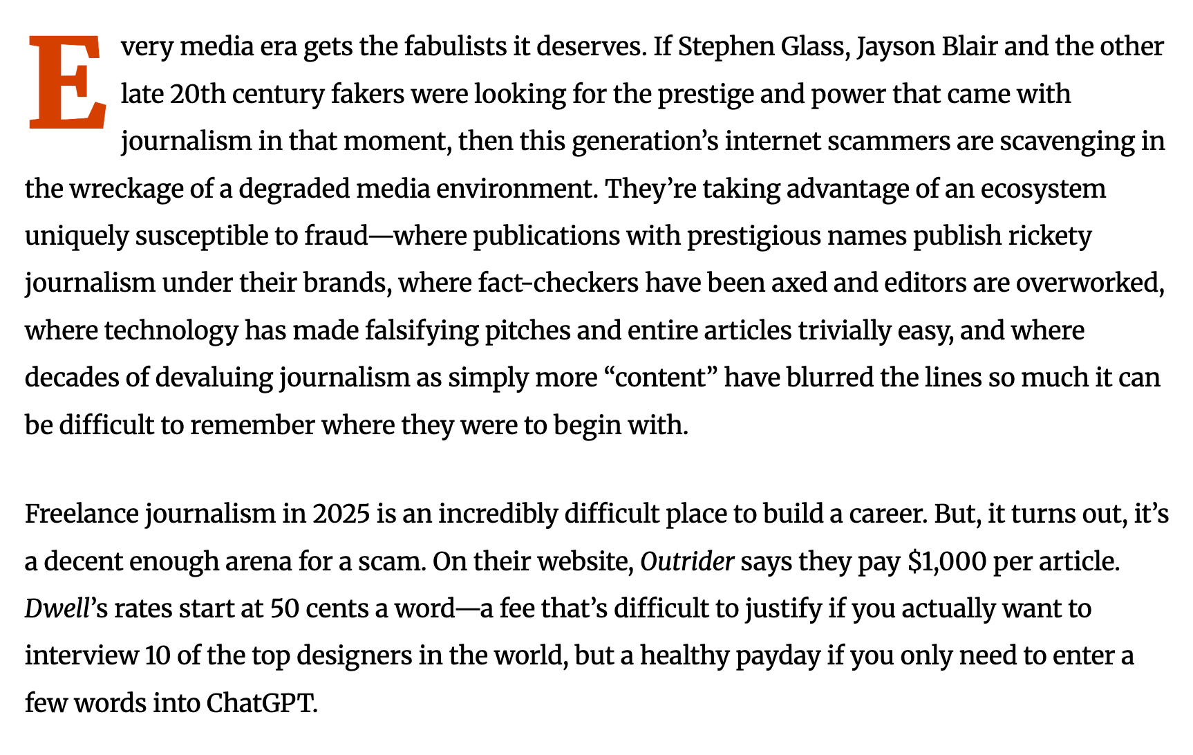 I am not trying to pile on the criticism, but I honestly cannot believe this has to be said: THIS IS NOT OK. No, you cannot use AI-generated writing in your pieces. No, all journalists are not doing it. No, it is absolutely not common practice. And yes, you will have your pieces removed and your assignments revoked if you try to pull this off in any self-respecting media publication. If a publication fails to notice the use of AI and publishes a piece that relied on it—something which is happening far too often—it will then retract it in full and typically issue an editorial apology.